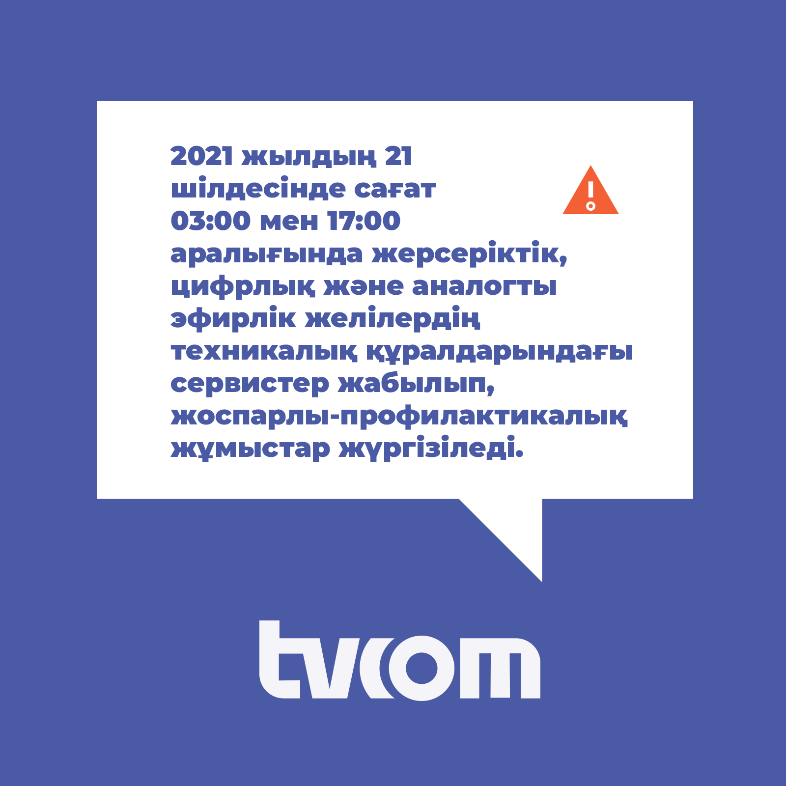 2021 жылдың 21 шілдесінде сағат 03:00 мен 17:00 аралығында жерсеріктік, цифрлық және аналогты эфирлік желілердің техникалық құралдарындағы сервистер жабылып, жоспарлы-профилактикалық жұмыстар жүргізіледі.